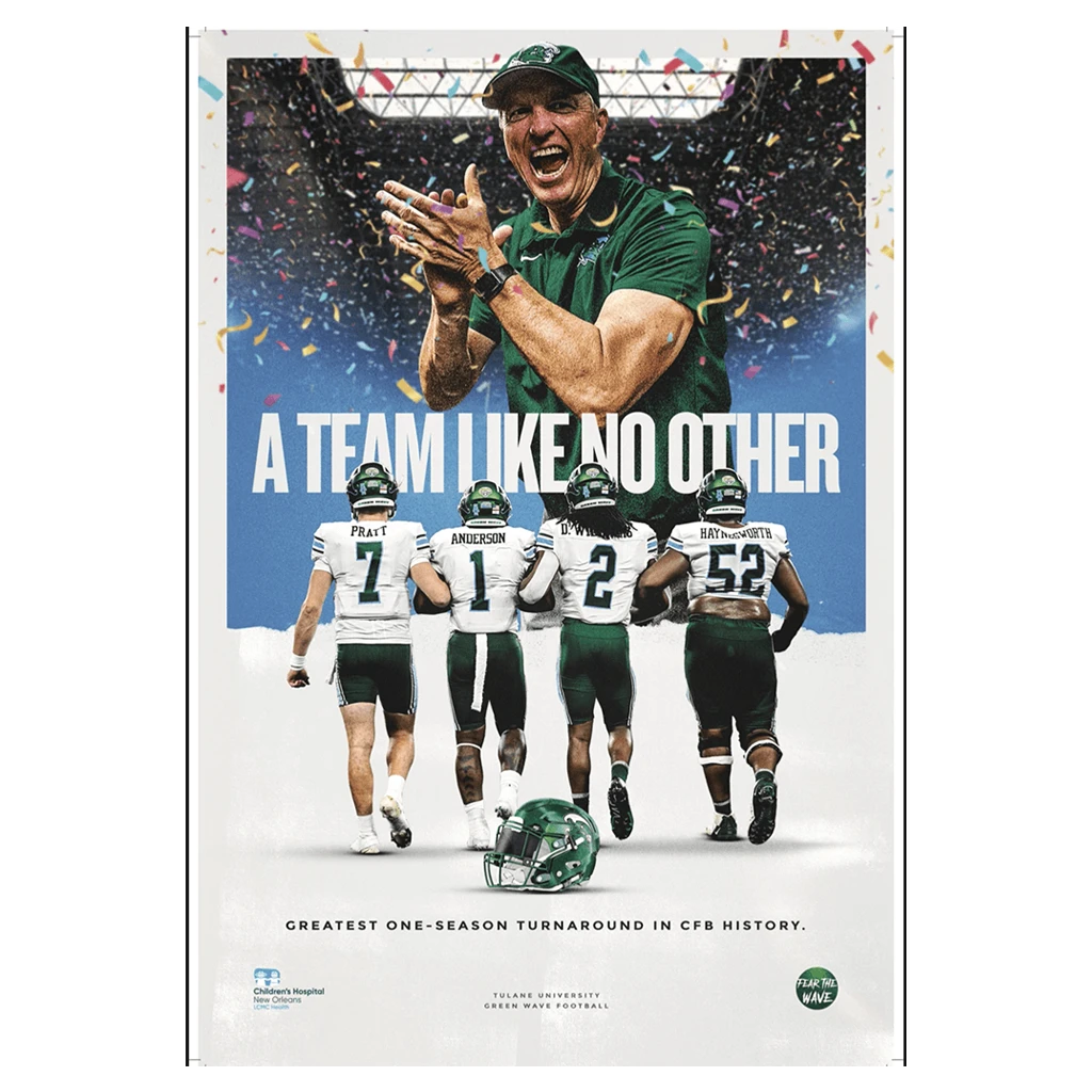 This “Team Like No Other” poster commemorates the 2022 Tulane football season that culminated in a conference championship and a Cotton Bowl title. This limited edition 12×18 full-color glossy poster is SIGNED by Head Coach Willie Fritz and the 4 Tulane captains: Michael Pratt, Nick Anderson, Dorian Williams and Sincere Haynesworth. A portion of the proceeds from the sale of this poster will be donated to Children’s Hospital in New Orleans. We expect the posters will be signed and ready to ship by the end of February 2023.