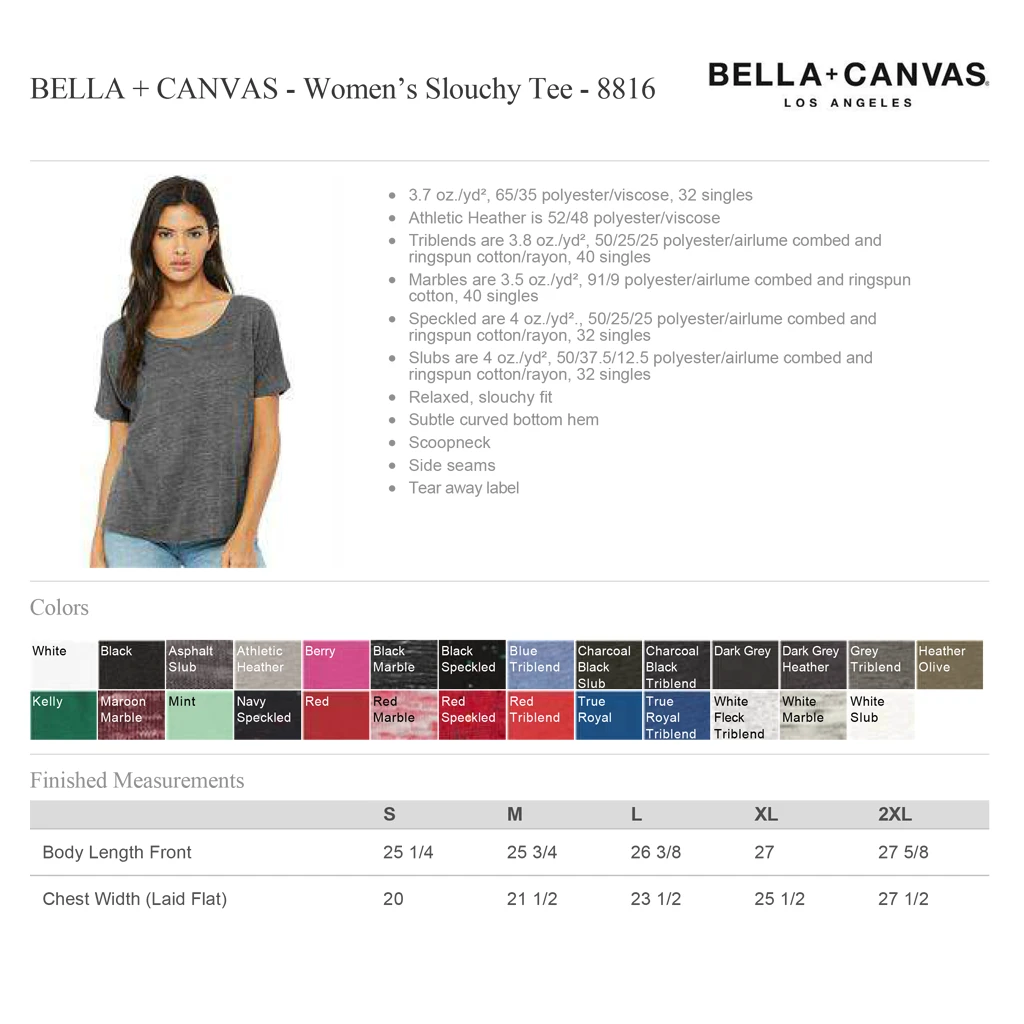 Printed on Bella Canvas, 65/35 polyester/viscose.