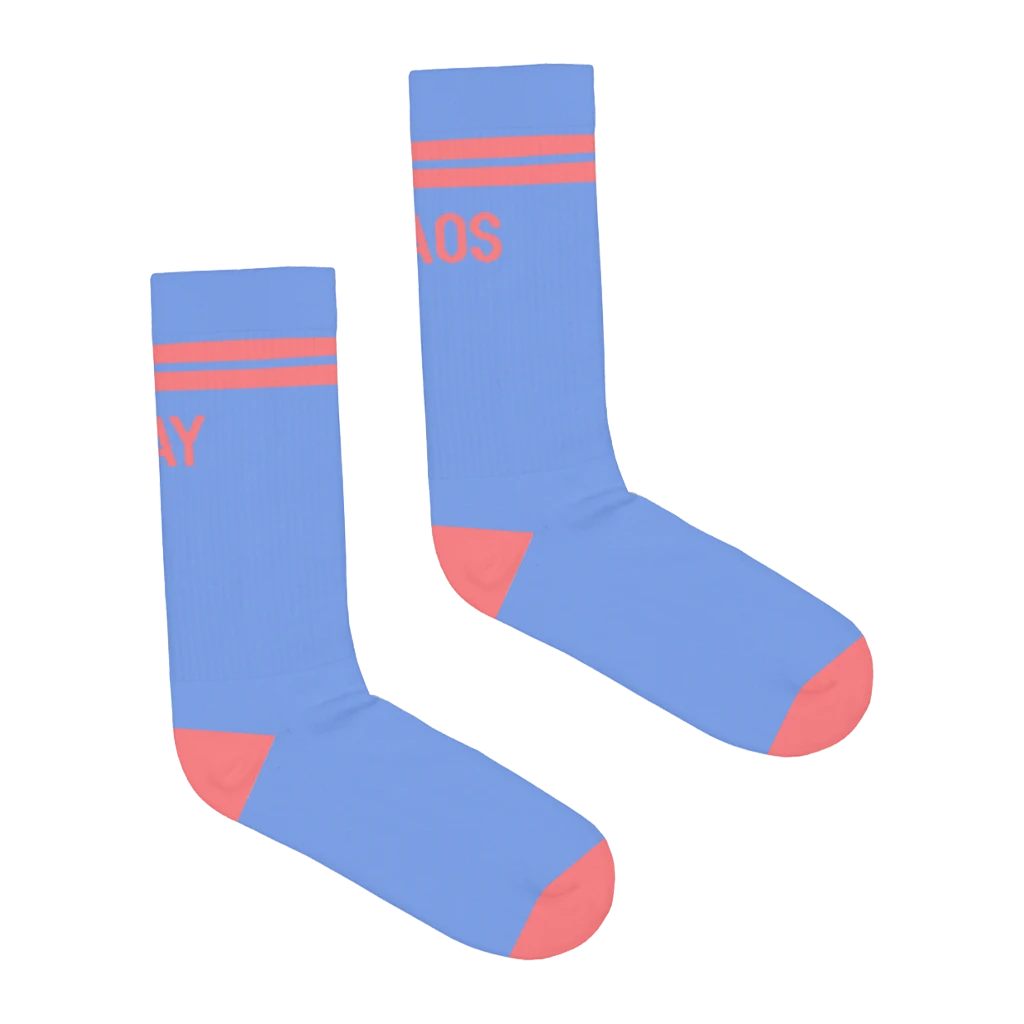 Your favorite gay chaos socks but blue and now with pink chaos.