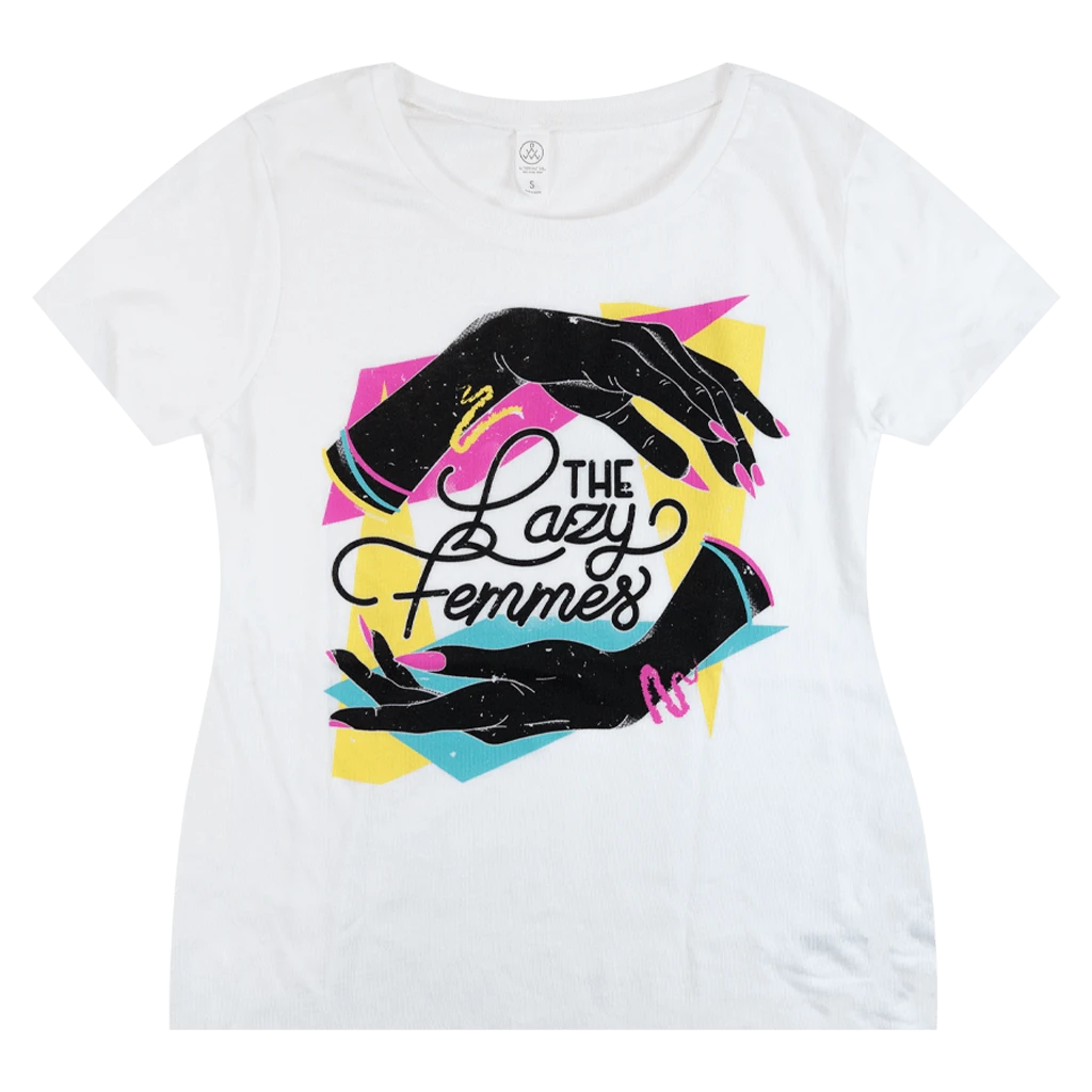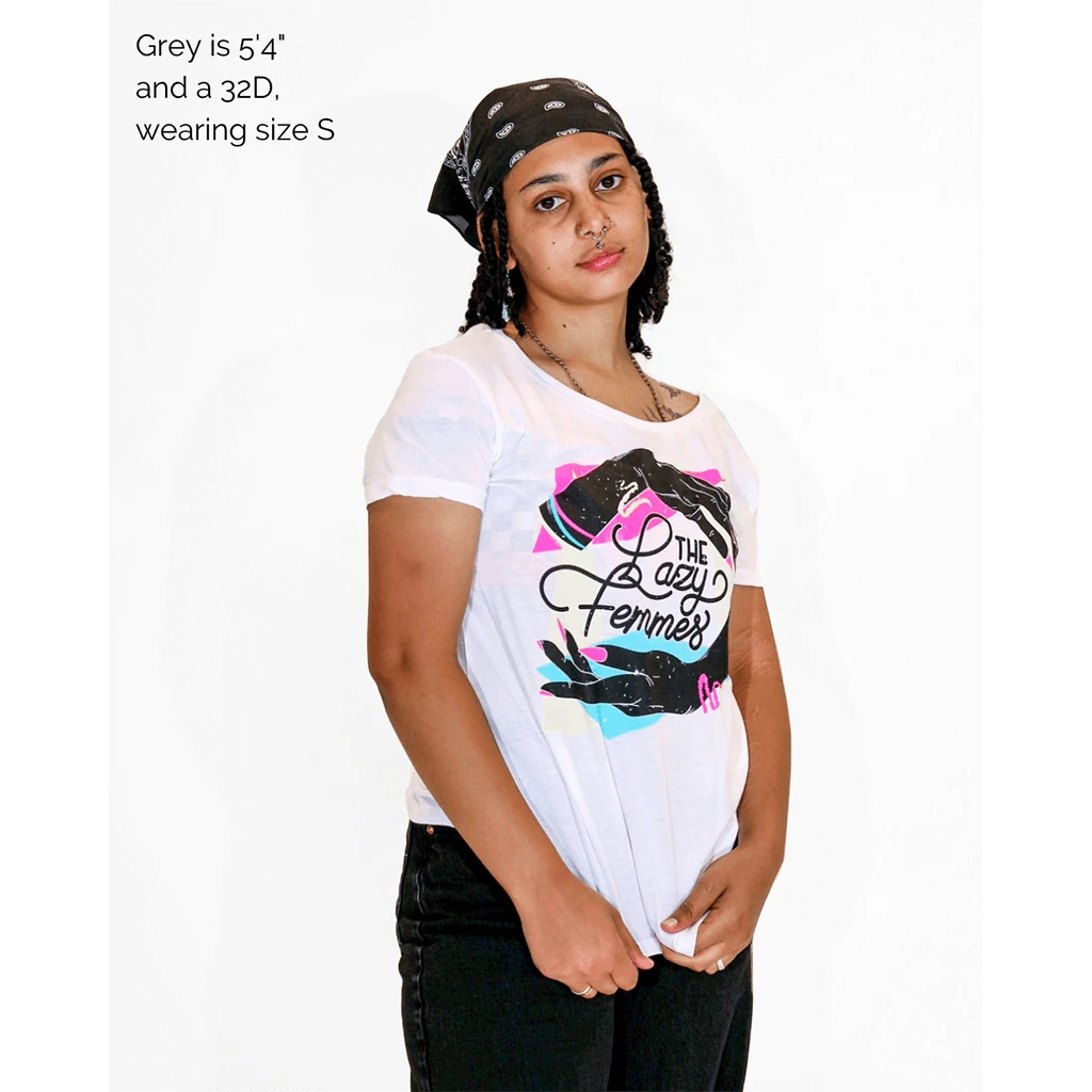 . Printed on a relaxed, scoop-neck women’s style tee.